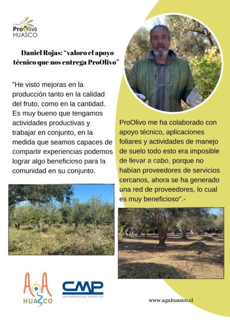 El Fondo ProOlivo tiene como objetivo central fortalecer la olivicultura en el Valle del Huasco, apoyando en terreno a los olivicultores, que hoy ven los frutos de este trabajo y expresan su opinión al respecto, Daniel Rojas, es uno de los usuarios de ProOlivo y entregó su opinión al respecto señalando que: “este es un proyecto colaborativo, económico, social beneficioso para el valle, porque genera beneficios como demanda de servicios y necesidad de mano de obra, hay varios benéficos derivados de la gestión de ProOlivo, esto corresponde a un esfuerzo conjunto, he visto mejoras significativas en los olivos, en el terreno y valoro el apoyo técnico que nos entrega la gente que trabaja en el Fondo”.