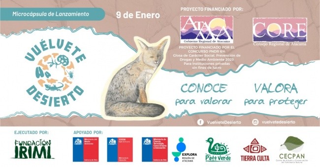 La Fundación Irimi desarrolla el proyecto de ilustración “Vuélvete Desierto”, donde se destaca en fichas con información científica a la flora y fauna de Atacama. En total son 13 especies nativas en que se describen sus características, territorios, cuidados y que van detalladas con ilustraciones. Cada una de las piezas será divulgada y puesta a disposición en la red, pudiendo ser descargadas para su impresión.