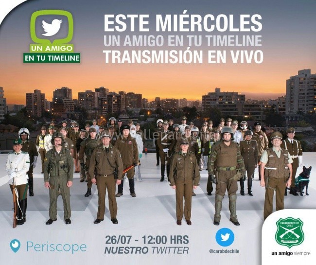 Hoy la institución lanza #UnAmigoenTuTimeLine a través de su cuenta oficial de twitter @CarabdeChile y consiste en la transmisión en directo de un programa de entrevistas que busca tratar temas preventivos de interés para la comunidad.