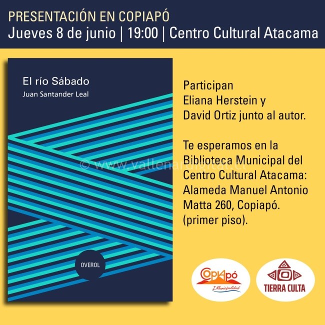 El autor copiapino Juan Santander Leal presentará su libro El río Sábado el jueves 08 de junio a las 19:00 horas en la nueva Biblioteca Municipal de Copiapó. La obra publicada por la editorial Overol a fines del 2022, cuenta con textos de su autor en formato prosa poética y en el estilo del escritor, deambulan por espacios imaginativos y cotidianos.