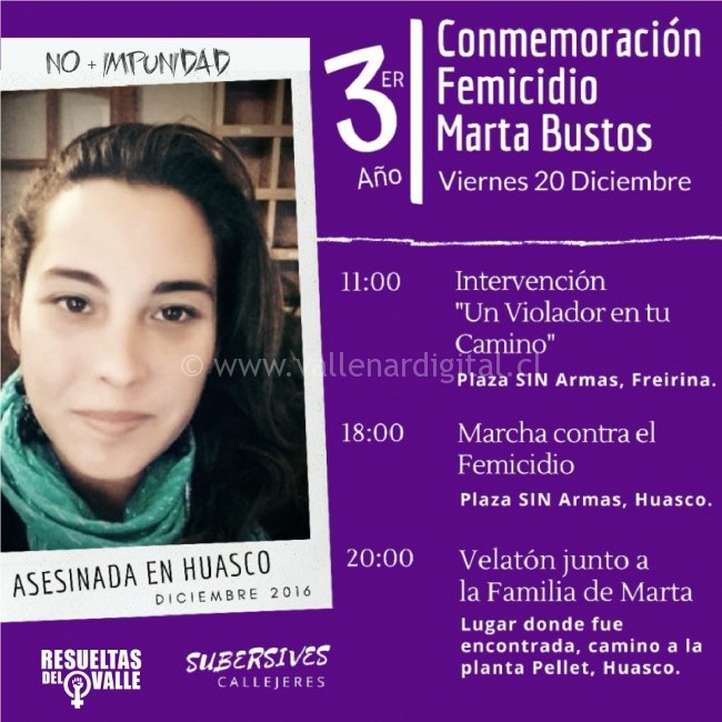 Invitando a todes a participar, en especial a vecinos y vecinas de la comuna de Huasco, iniciando con una intervención a las 11:00 en la Plaza de Freirina; y las grandes actividades MARCHA CONTRA EL FEMICIDIO a las 18:00 hrs desde la Plaza de la comuna de Huasco a la Velatón en el lugar donde encontraron el cuerpo de Marta un día 20 de Diciembre de 2016.