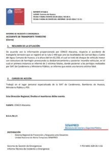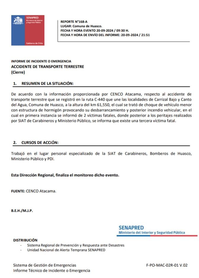 De acuerdo con la información proporcionada por la central de despacho del Cuerpo de Bomberos de Huasco, se registró un accidente de transporte terrestre en la ruta C-440 que une las localidades de Carrizal Bajo y Canto del Agua, Comuna de Huasco, a la altura del km 61,550, el cual se trató de choque de vehículo menor con estructura de hormigón provocando su desbarrancamiento y posterior a ello el vehículo se incendia. Cabe señalar, que a raíz de este accidente resultan dos personas fallecidas, mientras que con el pasar de las hora las autoridades actualizan la información e informar de un tercer fallecido encontrado en el móvil siniestrado.