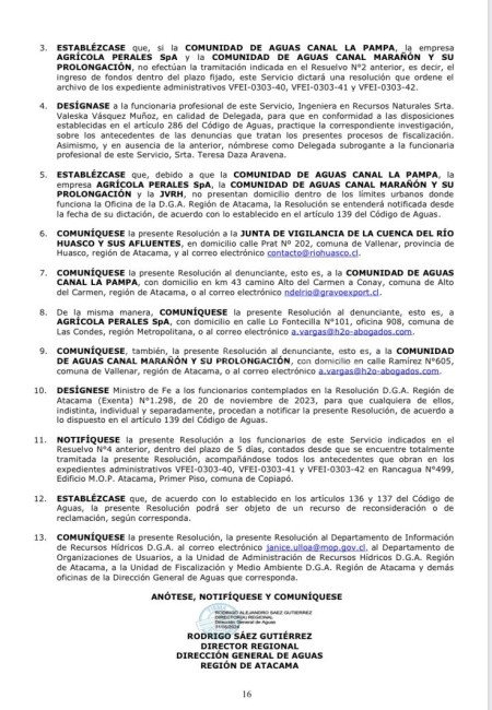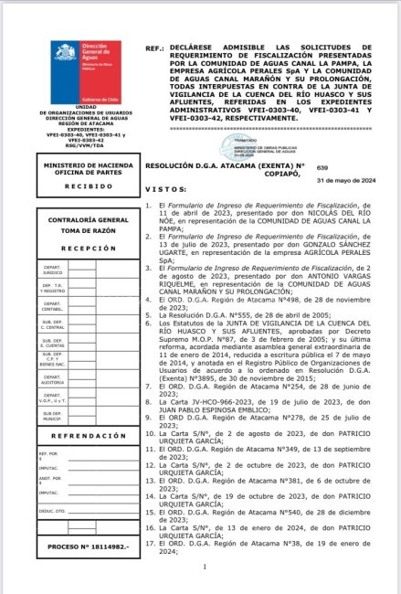 Mediante resolución (Exenta) n° 639 la Dirección General de Aguas (DGA) de  Atacama con fecha 31 de mayo de 2024, Copiapó, declaró admisible las solicitudes de requerimiento de fiscalización presentadas por la Comunidad de Aguas Canal La Pampa, la Empresa Agrícola Perales SPA y la Comunidad de Aguas Canal Marañón y su prolongación, todas interpuestas en contra de la Junta de Vigilancia de la Cuenca del Río Huasco y sus afluentes (JVRH), referidas en los expedientes administrativos vfei-0303-40, vfei-0303-41 y vfei-0303-42, respectivamente.