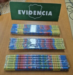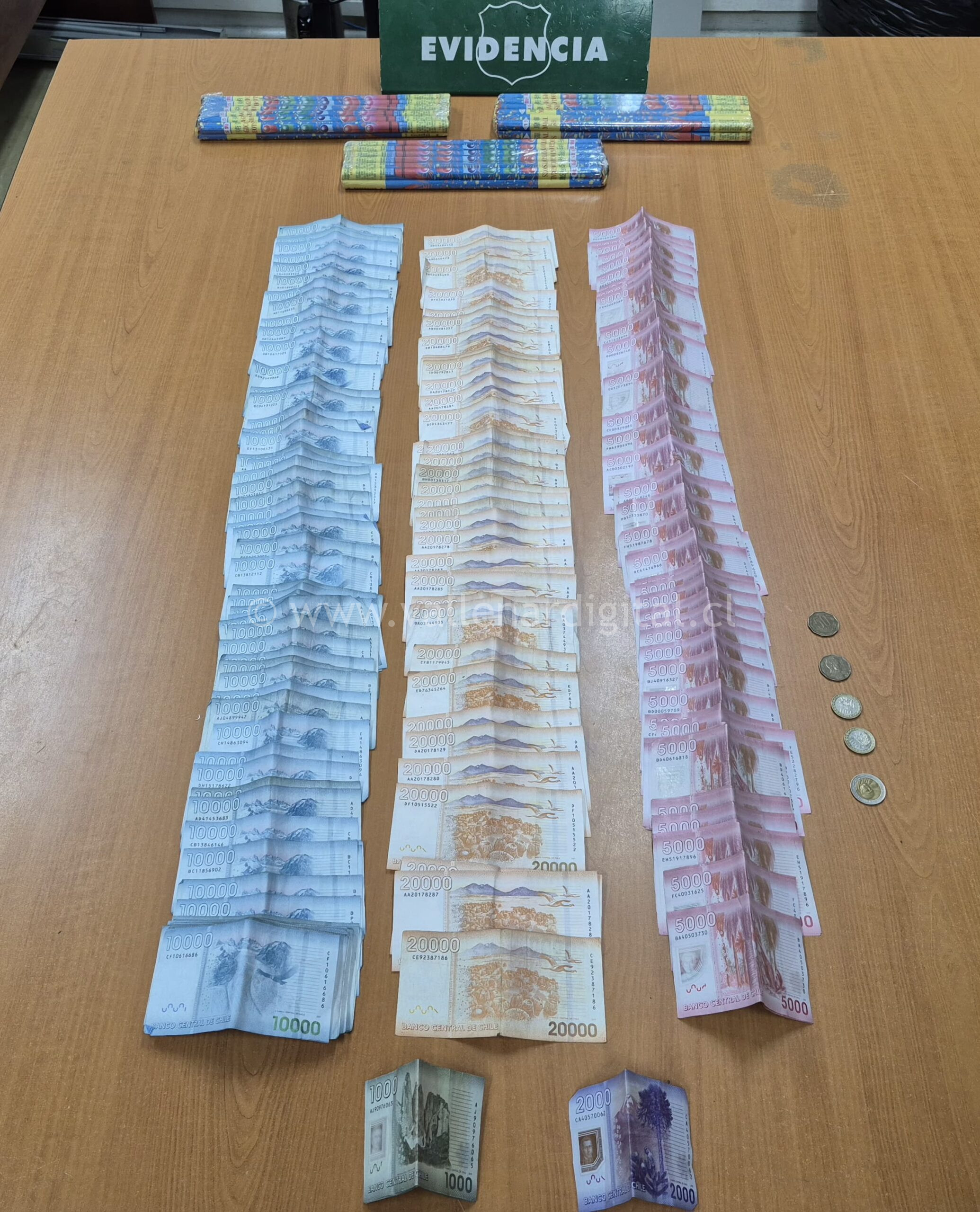 Por tal motivo, a este individuo se le incautaron tres paquetes de fuegos artificiales, con doce bengalas cada uno, (36 unidades de bengalas marca MAGICAL SHOTS). Asimismo, el detenido portaba la suma de dos millones de pesos ($2.304.800) en dinero en efectivo, sin entregar detalles de su procedencia, solo que es de su propiedad y no entrega una respuesta fundada ni justificada de dicho dinero, siendo incautado y remitido a la Fiscalía.