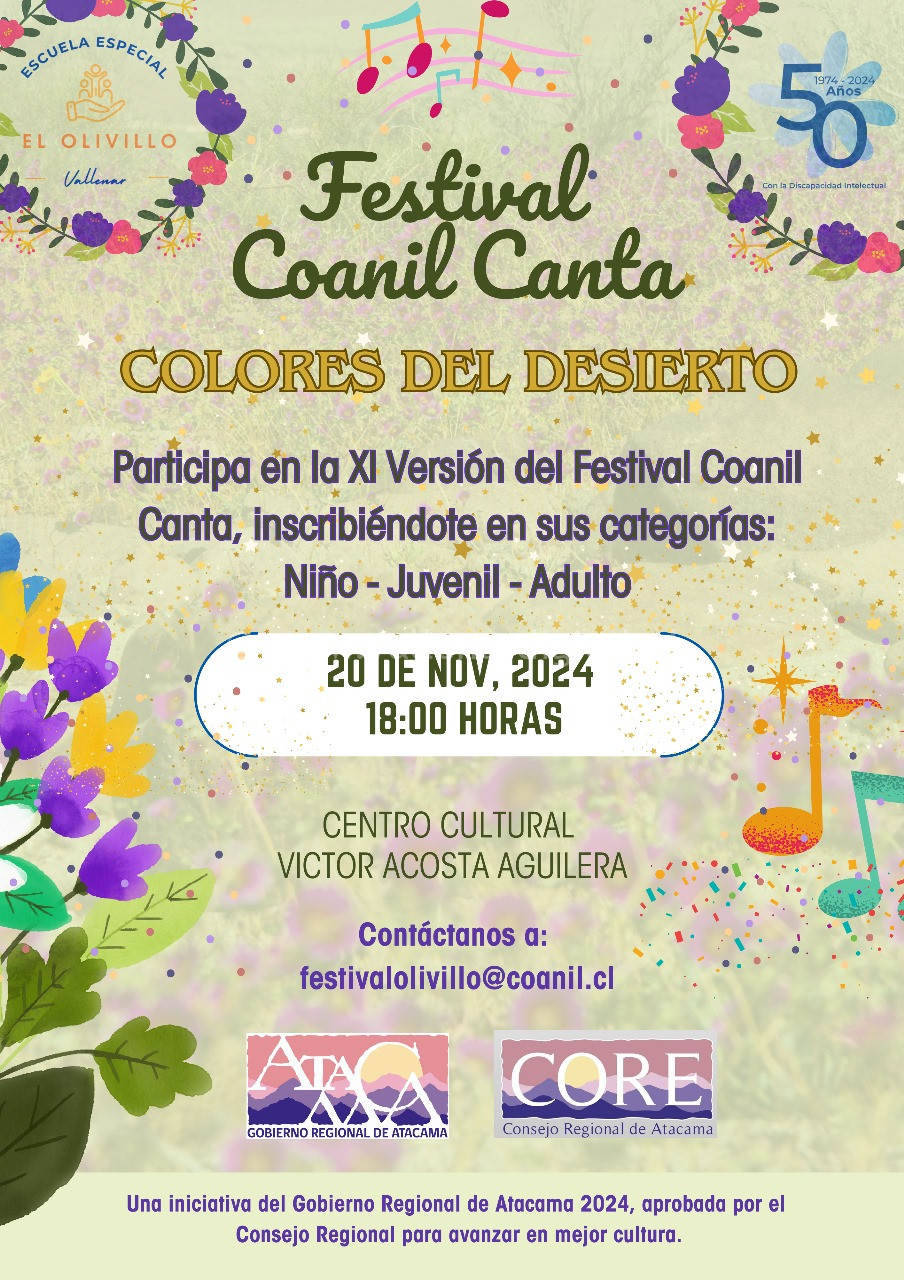 La Escuela Especial El Olivillo, de Fundación COANIL, invita cordialmente a los medios de comunicación y canales de transmisión a cubrir la onceava versión del Festival “Coanil Canta”, un evento que cada año destaca el talento y la dedicación de sus estudiantes en una jornada de música, alegría e inclusión. La cita será el próximo [fecha y lugar del evento si aplica], donde los asistentes podrán disfrutar de una experiencia única, preparada con esmero y entusiasmo por los niños y jóvenes de la Escuela El Olivillo.