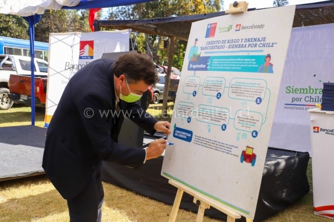 El ministro de Agricultura, Esteban Valenzuela, destacó que “hoy hemos fortalecido la alianza estratégica con BancoEstado con los proyectos de riego, además del programa Siembra por Chile y el financiamiento disponible para toda la familia agrícola a una tasa preferencial, la misma que aplica para los micro, pequeños y medianos productores que quieran postular a los beneficios de la CNR. A ellos les digo anímense a hacerlo, ya que contarán con financiamiento tanto para la consultora como la obra. El trabajo conjunto con BancoEstado nos permite brindar estas oportunidades e invito a todos a aprovecharlas, informándose sobre las características del programa y sus créditos en los sitios web del Ministerio de Agricultura, la CNR y BancoEstado.”