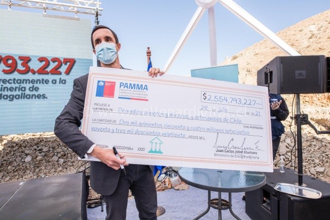 En un acto encabezado por el biministro de Minería y Energía, Juan Carlos Jobet, se formalizó la entrega por parte de la cartera de 2 mil 554 millones 793 mil 227 pesos del Programa de Capacitación y Transferencia tecnológica para la Pequeña Minería Artesanal, PAMMA.