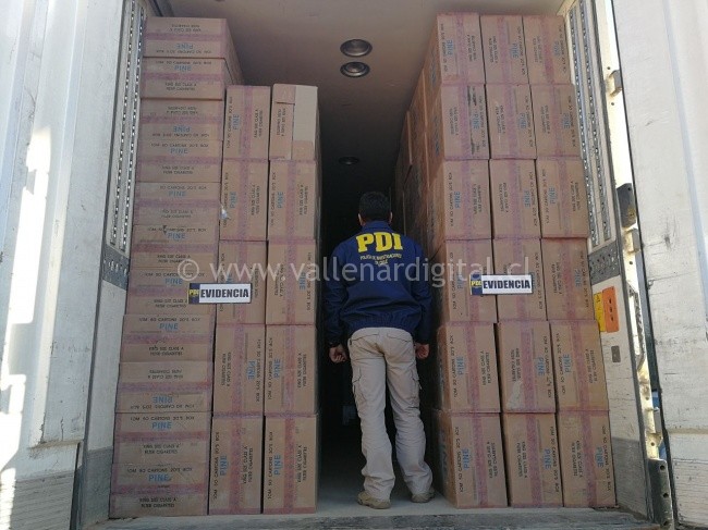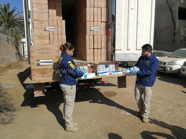 La diligencia policial se efectuó el lunes, en circunstancias que personal antinarcóticos y contra el crimen organizado de la PDI de Copiapó realizaba diligencias propias de su especialidad en el sector de la ruta C-5 Norte de Puerto Viejo. En la oportunidad, los detectives procedieron a la revisión de un camión tipo frigorífico de triple eje, detectando en su interior un cargamento de cigarrillos de diversas marcas, sin la debida documentación por parte de Aduanas.