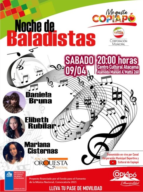 El espectáculo es organizado por la Corporación Municipal Deportiva y Cultural de Copiapó y la Secretaría Regional de las Culturas, el Arte y el Patrimonio. El show denominado “Noche de Baladistas” contará con las actuaciones de Daniela Bruna, Elibeth Rubilar y Mariana Cisternas, jóvenes artistas que deleitarán con su voz y capacidad artística a la comunidad.