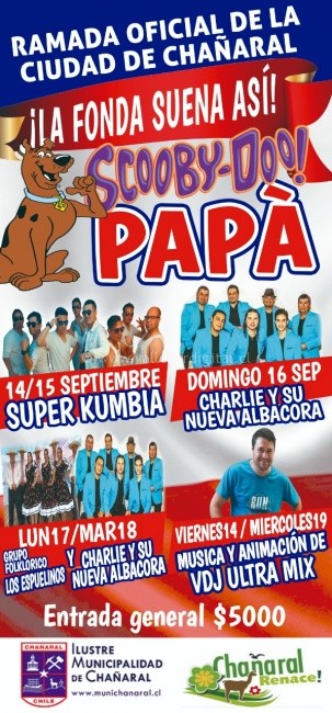 Pantallas LED, iluminación de primer nivel, sonido profesional y tres bandas de músicos, son solo algunas de las novedades que tendrá este año la Fonda Oficial Municipal de Chañaral: Scooby-Doo Papá!!! bautizada así gracias a la famosa canción que está sonando en todas partes y que promete sorprender al público que llegue a las ramadas en estas Fiestas Patrias.