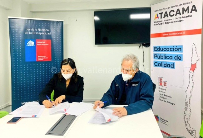 La directora regional del Servicio Nacional de la Discapacidad, SENADIS Atacama, Gabriela Villanueva y el director de Servicio Local de Educación Pública de Atacama, Carlos Pérez Estay, firmaron un convenio de colaboración en el marco del Concurso Nacional del Programa de Apoyo a Instituciones Educativas para la Inclusión de Estudiantes con Discapacidad 2021, que permitió el financiamiento de $6.782.460.
