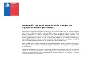 El Servicio Nacional de la Mujer y la Equidad de Género (SernamEG), dependiente del Ministerio de la Mujer y la Equidad de Género, confirmó que está brindando apoyo jurídico y psicosocial a la mujer que presentó una denuncia contra el gobernador de la Región de Atacama.