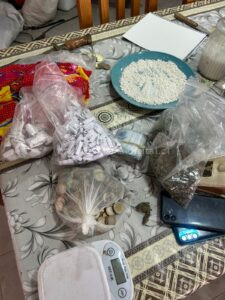 Dentro del domicilio, los efectivos hallaron el bolso con una gran cantidad de envoltorios de papel contenedores de sustancias ilícitas. Sobre una mesa, se incautaron además elementos asociados a la dosificación de droga, entre ellos un colador, un plato con sustancia blanca pulverulenta, dinero en efectivo, envoltorios cuadriculados y un datáfono.