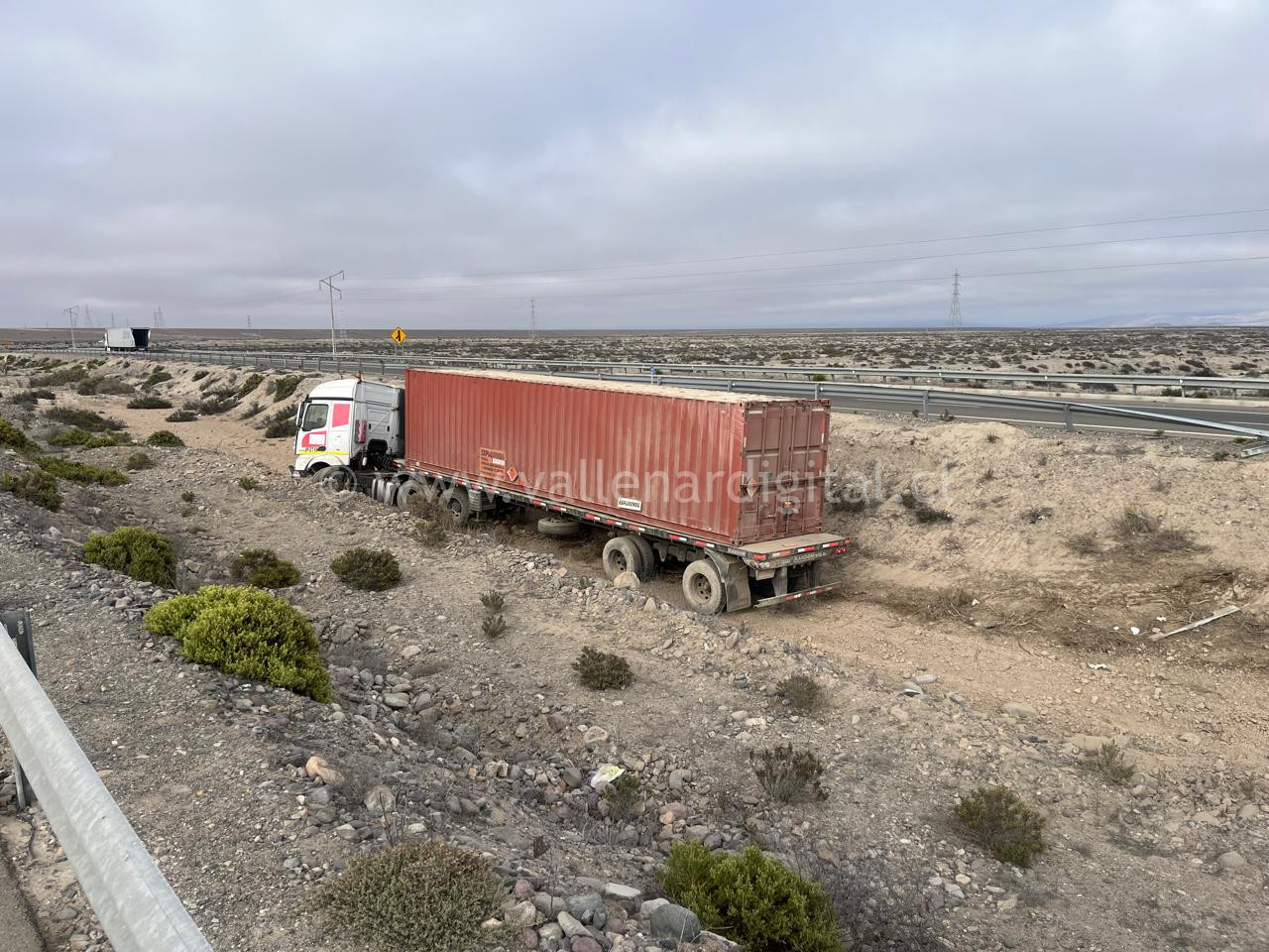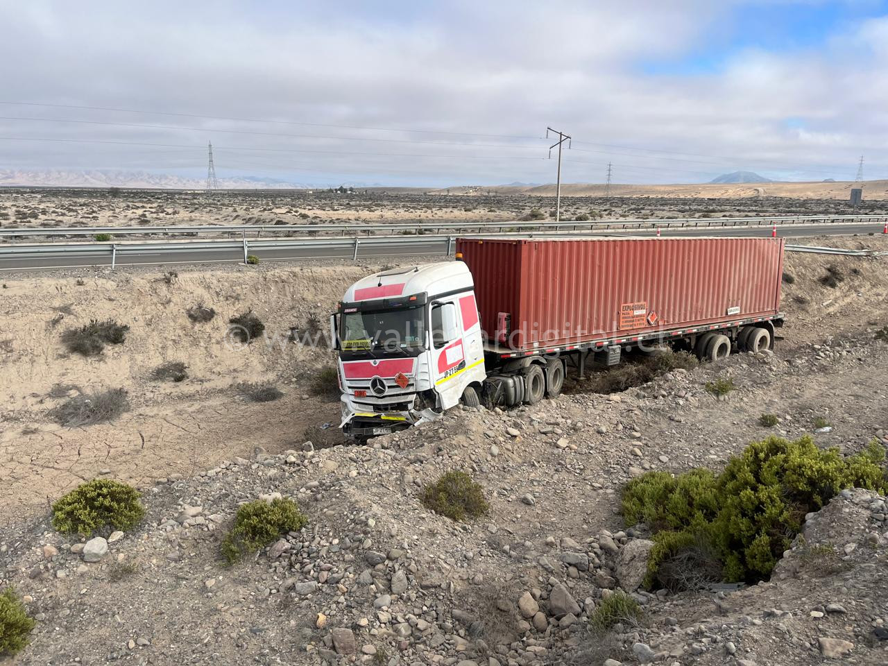 Durante la mañana de este sábado pasada las 09:30 hrs. un conductor quien diría un tractocamión quien transportaba explosivos y lo hacía de norte a sur pierde el control del móvil quedando en un bandejon central de la ruta 5 Norte.