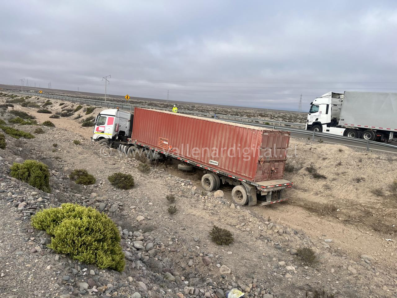Tractocamión quien transportaba explosivos termino en un bandejon central de la ruta 5 norte