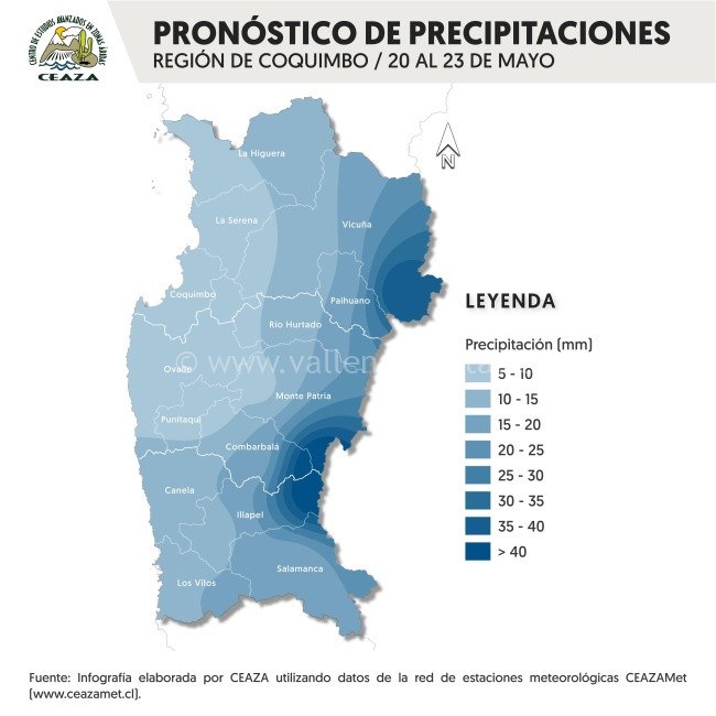 Se ha emitido una alerta por precipitaciones desde el área de meteorología de CEAZA. Tomás Caballero, meteorólogo del centro científico, señala que “se espera que entre los días 20 y 23 de mayo se produzcan precipitaciones en las regiones de Coquimbo y Atacama asociadas al paso de dos sistemas frontales, los cuales dejarían lluvia en costa y valles de la Region de Coquimbo y nieve en la cordillera de las regiones de Atacama y Coquimbo”.